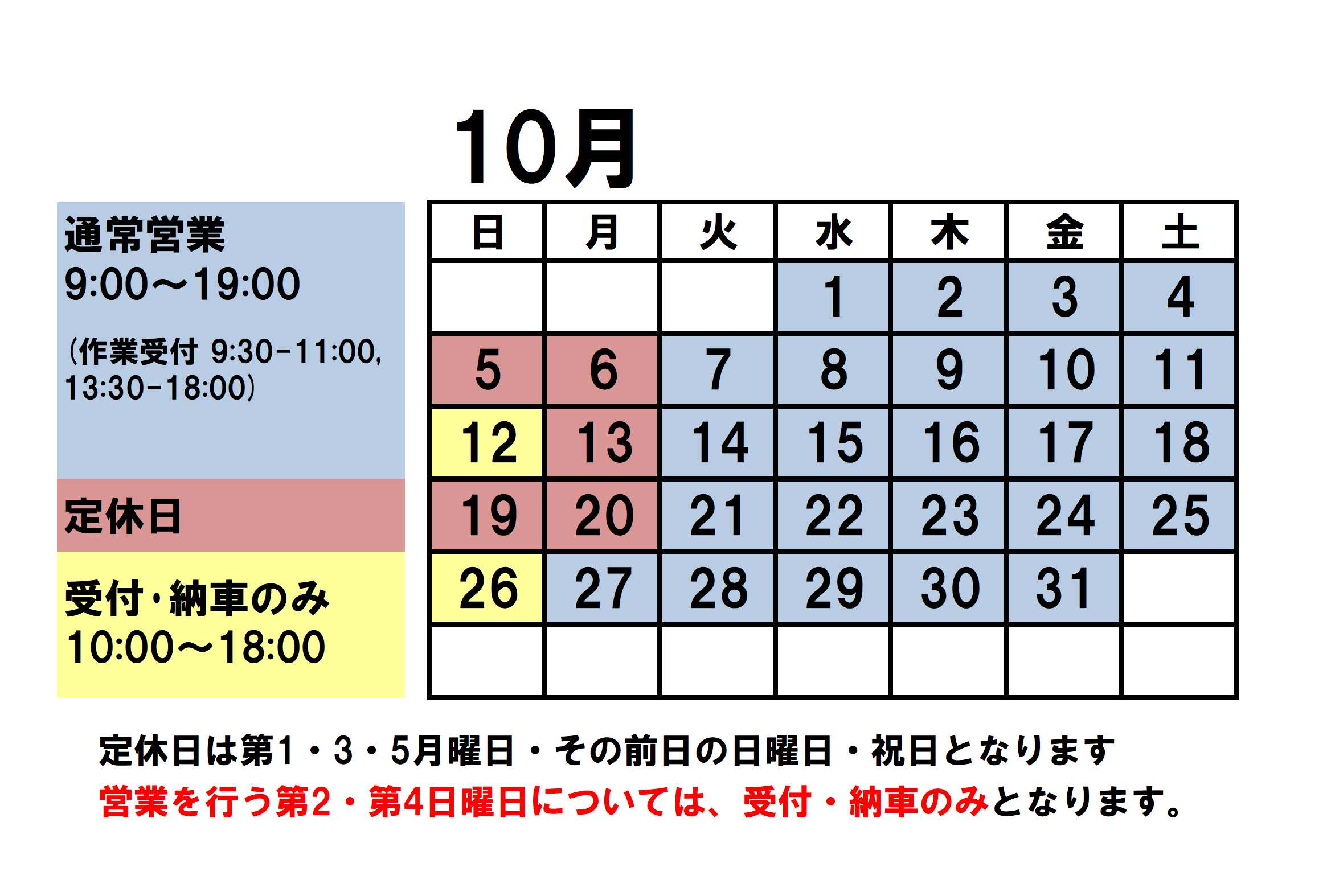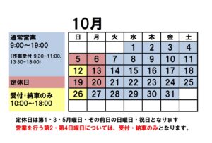 10月の営業日・定休日のご案内です。宜しくお願い致します。