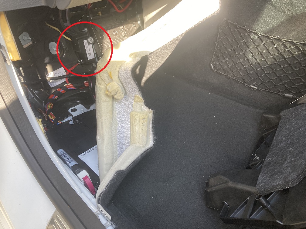 ↓ 赤丸部がバックアップバッテリーです。カーペットをめくると出てきます。