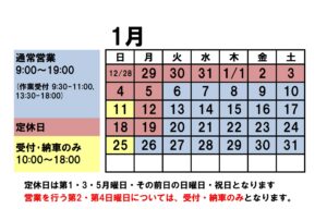 今年もありがとうございました 25.12.27 今年もたくさんのお客様にご来店いただきありがとうございました。 来年も皆様が安心してお車を乗っていただけるようスタッフ一同頑張ってまいりますので宜しくお願いいたします。 来年の営業日・定休日のご案内です。 12/28~1/5まで休業となります。新年は1月6日(火)9時より営業いたします。