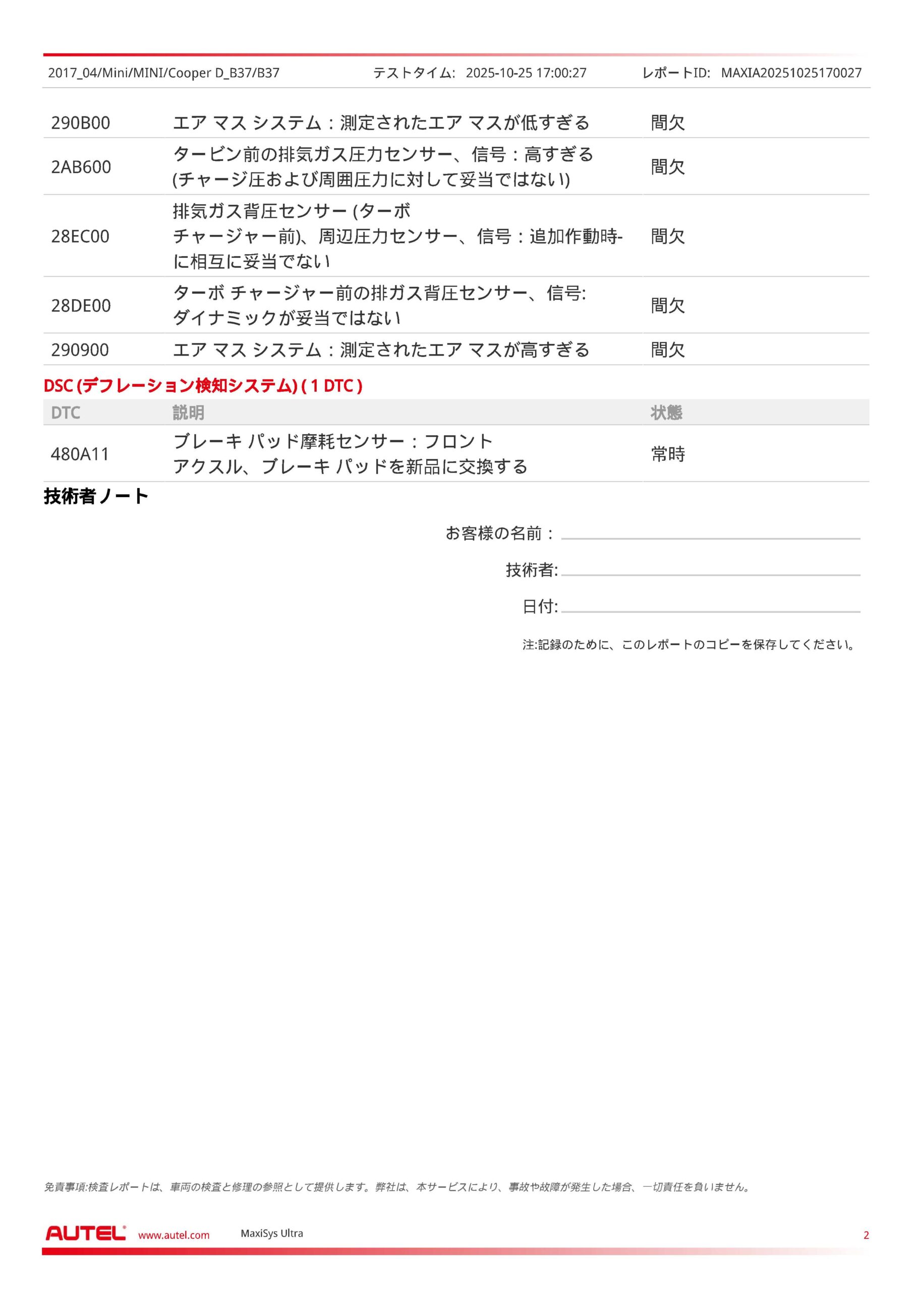 診断機をつないで確認してみたところ、ターボチャージャー前の排ガス背圧センサーの信号が妥当ではない様子・・・