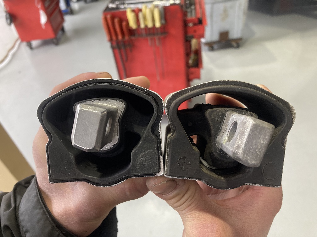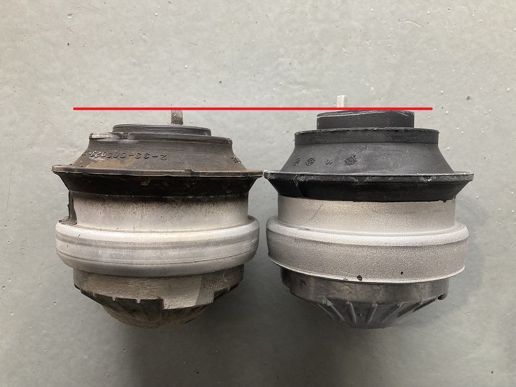 取り外したエンジンマウントを新品と比べてみると潰れてかなり高さが違うのが分かります。