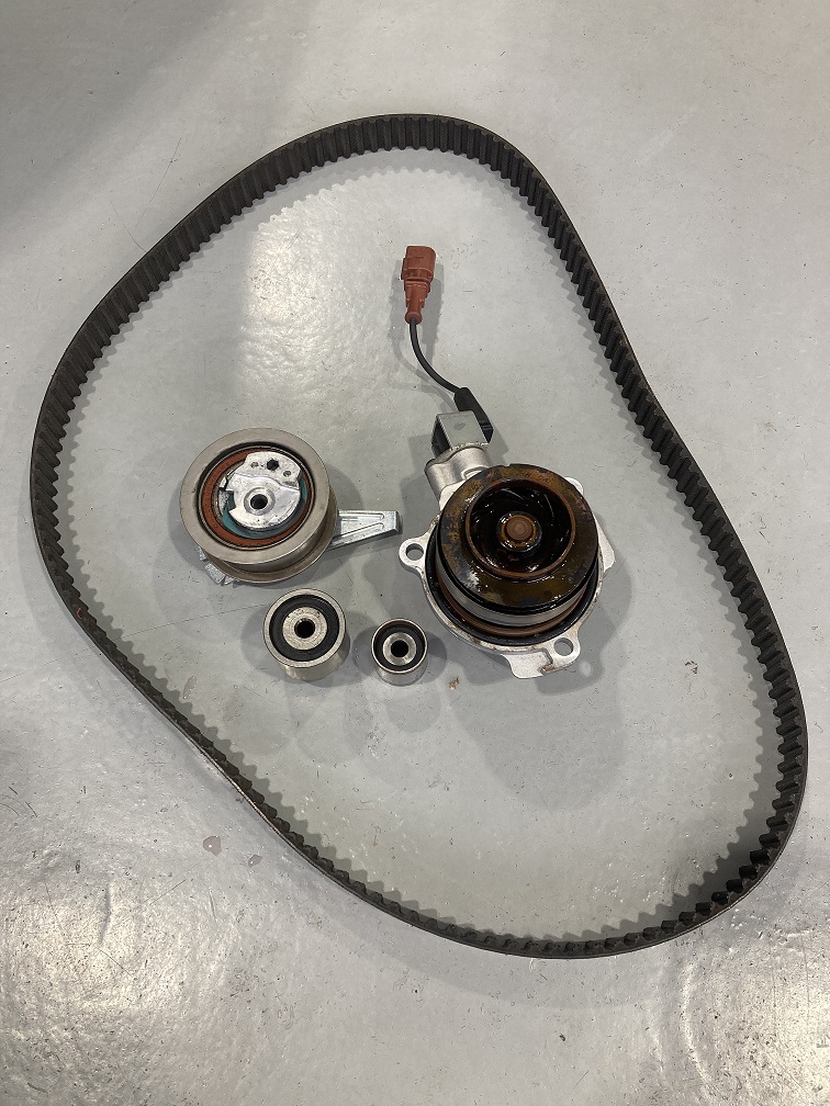 ウォーターポンプからの冷却水漏れや異音の発生は無かったのですが、今回タイミングベルトキット交換と同時にウォーターポンプも同時交換させていただきました。